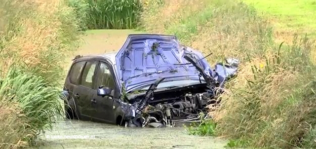 Hierna sloeg de auto enkele malen in de lengte as over de kop en kwam op zijn wielen in de ondiepe sloot tot stilstand.