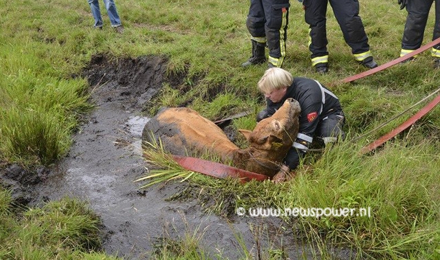 De koe stond diep in de modder en was al redelijk ver weggezakt. Met een brandslang en de nodig mankracht werd de koe uit de sloot getrokken. De koe raakte niet gewond. En als dank voor zijn redders maakte het dier in de wei ook nog even een heuse vreugdedansje!