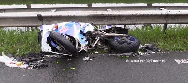 De auto kwam frontaal in botsing met de glijdende motor en kwam op het naast de weg gelegen fietspad tot stilstand. De motor kwam tegen de vangrail tot stilstand. De voorste motorrijder kon zijn motor onder controle houden en bleef overeind.