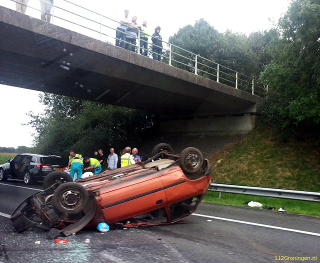 Zij sloeg met haar auto meerdere keren over de kop. Via de middengeleiding kwam de auto op de kop tot stilstand op de rijbaan. Moeder en kind zaten beiden in de gordel. Zij werden voor nader onderzoek meegenomen naar het ziekenhuis.