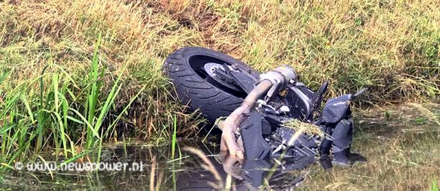 (VIDEO) Rouveen – Een motorrijder is dinsdagmiddag tussen Rouveen en Hasselt met motor en al in het water beland na een aanrijding met een personenauto.